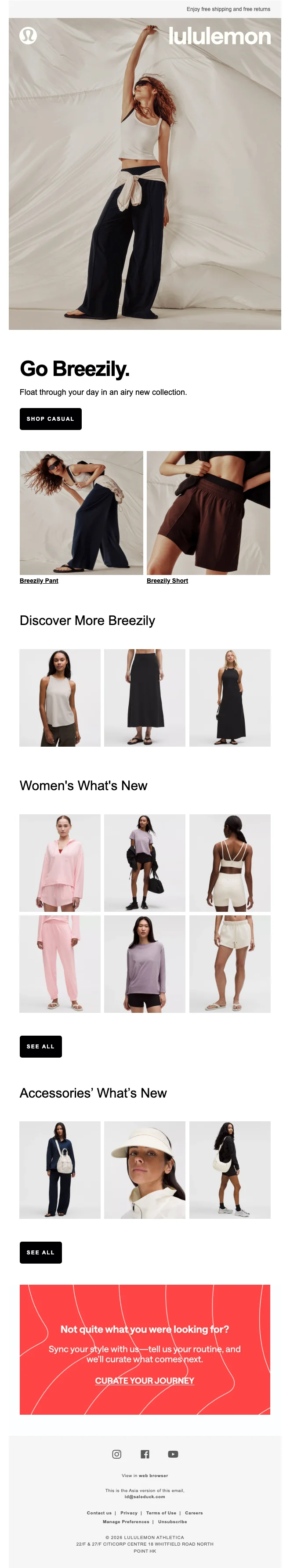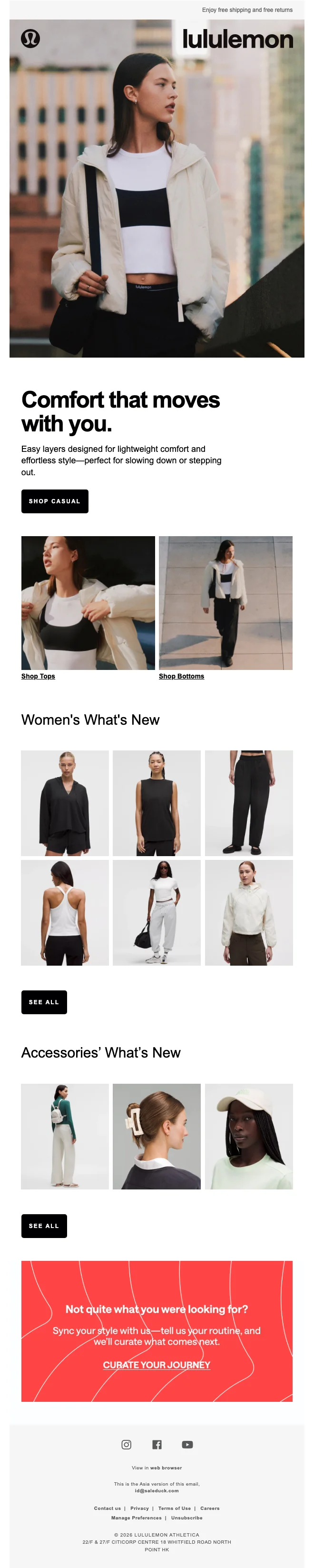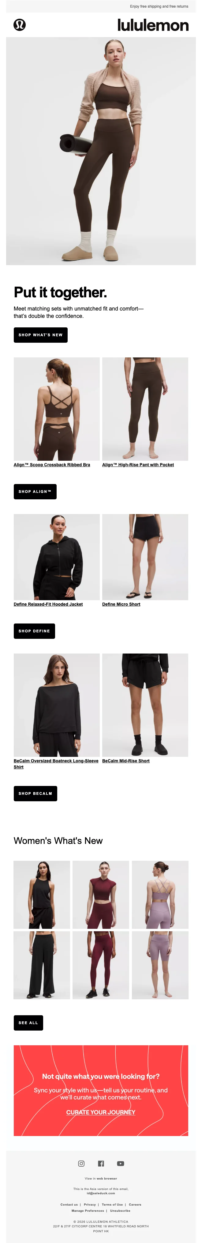 Berolahraga dengan pakaian yang nyaman dan trendy dari Lululemon tanpa biaya tambahan untuk pengiriman. Nikmati keuntungan bebas ongkir ke seluruh area pengiriman Lululemon. Dari legging yang lembut hingga tank top yang mendukung, semua pilihan Anda dikirim langsung ke pintu rumah Anda. Tanpa minimum pembelian, setiap item menjadi lebih terjangkau. Manfaatkan kesempatan ini untuk memperbarui lemari pakaian olahraga Anda sekarang!